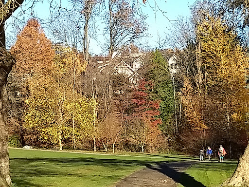This park has been a favorite of mine for over 50 years. My father loved the history of the little ravine that runs through it. Hundreds of years ago, the stream that runs through it was a fishing place; and the valley was a summer gathering place of the people indigenous to this area. As a child I visited often because my mom's and my therapist had an office right at the top of University Way, next to the Antique Oriental Rugs shop that's been on that corner for at least 50 years (as far back as my memory of that corner goes). She used to take me and her sweet old Golden Retriever, Hannah, on walks through the park. I loved the old playground, back in the 70's it had this huge log-rolling thing, a huge spinning log with a handrail and kids could run like hamsters on a wheel...until they tire or slip. There was one of those carousels where one kid pushes? It's much better-and safer! now. There is a fun playground with a zip-line tire swing-SO cool- and swings and climbing stuff, but there are also trails that run throughout the whole area. Along the hillside, under the overpasses, and down to another playground on the East end of the same green belt where it becomes Ravennah park. There are also large open green spaces for throwing frisbee, playing soccer or football or throwing a ball for your dog (technically,_ leashes are required). There are lots of big old trees, and it's a beaufiful place. Do be very aware that like most urban parks these days, there are unsheltered individuals in close proximity and keep an eye out for unsafe items on the ground, or...