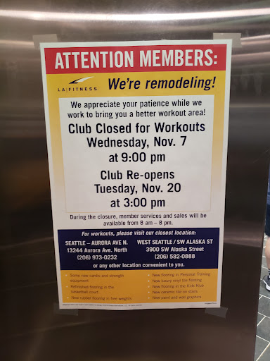 Update 10/24/18: This place sucks. I paid for a year membership ahead of time, only to learn they are shutting down the whole gym for 3 weeks next month (November). Their solution? Drive to West Seattle. Thanks LA Fitness, but I'd rather choose another gym and pay double the fee than allow you to treat me like garbage (see comments below related to management and lack of competition).