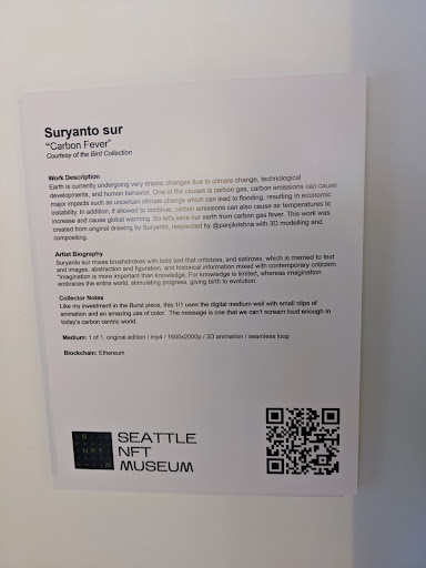 Read moreOkay, look. I decided to go to the Seattle NFT Museum specifically to laugh at how ridiculous it is, and I walked out absolutely blown away by how fun and interesting it was. I had the best time and thought the exhibits were incredibly well done. It's a small-ish museum (it took me about an hour to read everything) but the information presented was fantastic (from details about the art/artists to information about cryptocurrencies and the blockchain). I found that the art ranged from pieces I actually really liked to pieces that made me think "why is this here", which is exactly how I feel at most art museums so I felt the collection was well curated. Additionally, Casey at the front was just great. He was so attentive, made such an effort to ask me about why I was there, what level of experience and knowledge I had in NFTs, and shared additional details and information about the exhibits. I came in curious but expecting to hate the museum and I walked out so thankful that I decided to go! 10/10...