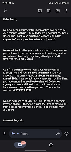I reached out to Chauna who told me there was no record of my cancellation. I had to either mail a letter to the gym (to cancel again) or drive an hour and a half into West Seattle to do it in person. I drove there, canceled again, and was given a confirmation of my cancellation.