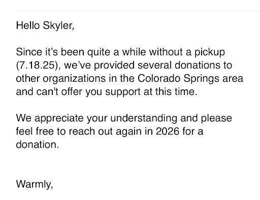 I never leave bad reviews but felt like I needed to share about two past experiences. I run a small nonprofit and the past few years Big R has donated to an annual event that we do. Last year they donated a cooler. When I picked up the donation, I confirmed it was the correct item since the email stated a certain brand was being donated but the store gave me a yeti one. They confirmed it was the correct one. A week or more after my event, the store manager called (Widefield location) and asked for the cooler back (that they donated) and said they gave me the wrong one. I explained it was already given away at our event. He got upset and hung up. This year (constitution location) the store said they would donate. On 7/18 they said the donation would be ready in a week. I have always come the week before the event to pickup donations and there's never been an issue with that. I went in the store yesterday 8/28 and politely said I was there to pickup the donation. The manager or whoever I spoke was extremely rude. She said they weren't donating to me anymore because I took too long and complained how they had to cancel the items and she told corporate that I never came. I was shocked. I have never had a store employee in my life speak to me the way this employee spoke to me. Other customers in the store were looking because of this. She went on how they canceled the $25 gift card and she won't redo it and I need to speak to corporate. I reached out to corporate and was sent a rude email that I took "too long" and they will no longer donate to my event, which is for military suicide prevention. Nobody called or emailed me about it needing to be picked up by a certain date, or I would have done so. Again, I've always picked up the week before my event and it's never been an issue in the past. I have been in the nonprofit world for several years and have never been met with such rudeness and had a company "take back" a donation, not once but TWICE! I definitely will not be giving them any business in the future and do not want to ever seek a donation from them again if this is how they treat nonprofits and customers. A simple email or call to let me know the donation needed to be picked up by a certain date would have been nice. Instead I wasted my time and was scolded by an employee and humiliated. The email stated that I didn't pick up since 7/18 but the donation wasn't suppose to even be ready...