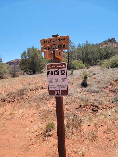 Read moreBaldwin Trailhead is on a dirt road after, traveling west on Verde Valley School Road where pavement stops about 1.1 miles from the trailhead parking lot. This is 7 miles south of Sedona in the Village of Oak Creek. So, when the road ends and turns into a dirt road, keep going about 1.1 miles. It's very visible. You need a pass or pay to park, and very limited parking on road. They will ticket you, so be aware of no parking areas. Baldwin Trail is a two mile loop and DOES NOT GO TO OAK CREEK!! You need to connect to (Crescent Ranch)Red Rock Crossing Trail, (down stream)that leads back to the left and goes to the end of the dirt road (WHERE THE CREEK IS). From there, you can walk about .2 miles on the dirt road back to the parking lot. Or when you see Templeton Trail, that goes to the right or left depending on which way you entered Baldwin trail. You can follow that instead. Templeton Trail follows the River to the northeast or upriver and leads, to Budda Beach. If you continue on Templeton, it leads away from the Creek to Cathedral Rock!! If you enjoy the Creek, then you will see more if you follow Templeton. Trail is sandy and rocky, so as always, use good hiking shoes. Flip flops or water shoes will not protect your feet, so if you are carefree and a risk taker, you might want to consider that option...your choice. This trail is dog and...