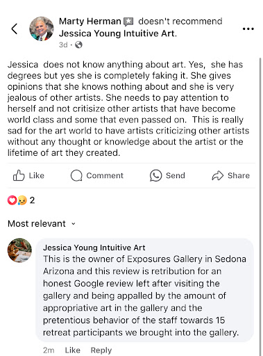 One of our attendees was a former professor of Native American studies for 35 years and questioned the lack of representation by native artists in the gallery despite the many, many depictions of native people, symbols and culture. At this point I asked one of the staff to confirm if any of the artists were native and she brought me to the one and only Hopi artist they had in the space. I thanked her and that was that. Some of the patrons felt ignored, dismissed and followed by staff. This is reflected in my review. I was accused of bashing artists yet I did not mention any artists at all in any part of my review.