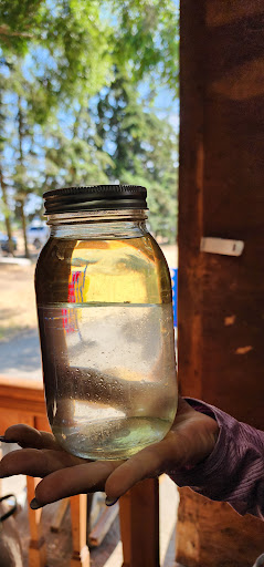 Later, while Dave went back to the hot fields to harvest more lavender, Melissa showed me her lovely copper equipment from Portugal where she distills the lavender and patiently answered my questions about it and showed me where they dry lavender. She showed me a glass bottle (in the photos) of the hydrosol (the clear liquid at the bottom) and lavender essential oil at the top to show me how much oil comes from distilling each batch of lavender plants.