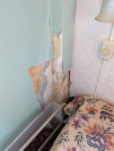 It's a very old building with not much put into maintenance and repair, so it looks like the set of an old-west distopian future. Wallpaper peeling, crumbling plaster, cheap laminate replacing missing wood trim. Dirty spotted carpets missing in places. The overhead light fixture in front of our room was broken with dangling wires next to a fire exit door that has such a bad seal that it sufficiently lights that end of the hallway.