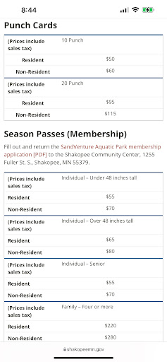 Price hikes for the soon-to-be-reopened park make this $330 for a resident family season pass (unlimited visits) and $480 for non-resident family season pass (unlimited visits). ValleyFair is $89/person for a season pass (5 and under are free) (i.e. family of 4 is $356), so waterpark + theme park + fall daytime admission + parking for $26 more, and that’s for anyone, resident of Shakopee or not.