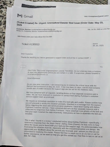 After 56 days, and as of July 31, 2025, Ashley Furniture's corporate office has once again failed to provide the correct size support legs for my Danizer bed. This continued incompetence is baffling, especially given the clear safety implications. The removal of the Danizer bed from display at the Ashley Furniture store on Hall Rd in Shelby Twp, MI, strongly suggests that this product is unsafe. My only resolution at this point is for Ashley to pick up this bed and issue a full refund, or to provide a completely different, usable bed that can actually be properly assembled. The complete lack of communication and customer care throughout this process is truly...