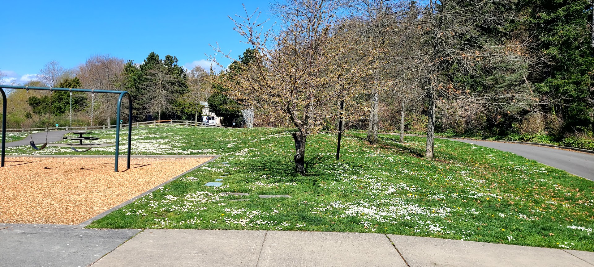 Quaint, tucked away neighborhood park with a playground for toddlers and school-age children. It includes swings, a slide, climbing set and a grass play area. This is a small space with big views overlooking Puget Sound and the mountains. The park is good for quiet family time. There's no beach access though but definitely visit to experience the awesome sunsets and passing trains. Parking is easy but very limited. The onsite bathrooms are clean and kept. If you're unable to park and enjoy this space, drive to Richmond Beach Saltwater Park down the road. You'll find parking, beach access and similar views of Puget Sound. There's even a playground in the middle of the parking lot. Note, this space involves a little walking but it's pleasant....