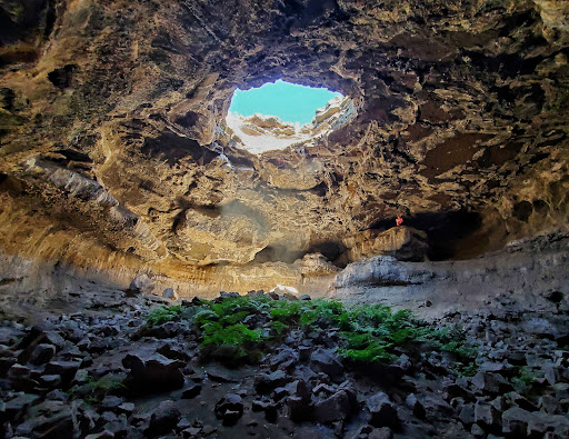 The cave itself is very impressive. Short experience, and I wouldn't plan on spending a whole ton of time here. It's a single large teapot chamber accessed through the "spout" of the teapot. The entrance requires a little butt-scooting, but the climb back up isnt bad, as long as you have decent tread on your shoes. The spout is just a few yards eastward from the main large opening, it's a smaller hole. Don't mess with the ferns guys, they're like the only ferns at all in this area of Idaho so just let them be and don't trample them, we'd like...