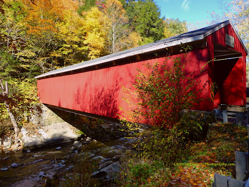 This distinctive red-with-white-interior covered bridge measures 96' in length, and sports a Howe truss design, which can only be found in three other still-standing PA covered bridges. Located in Lawrence County in Portersville, this bridge is constructed with vertical board-and-batten siding, which was common among Pennsylvania covered bridges in the 19th century. A one-foot “window” beneath each of the top chords enables light to penetrate the bridge's otherwise...