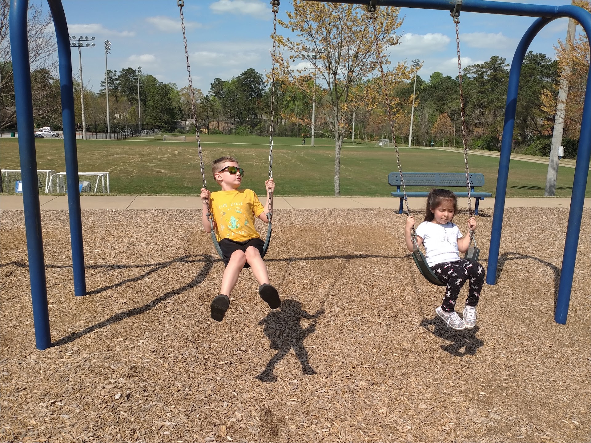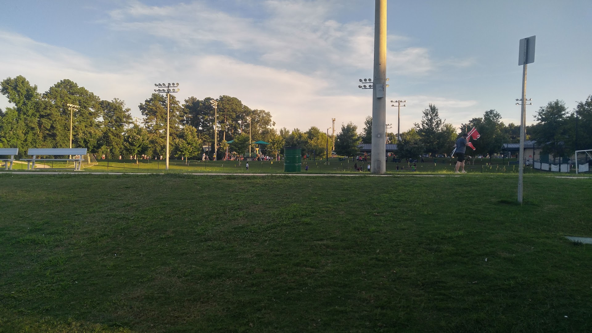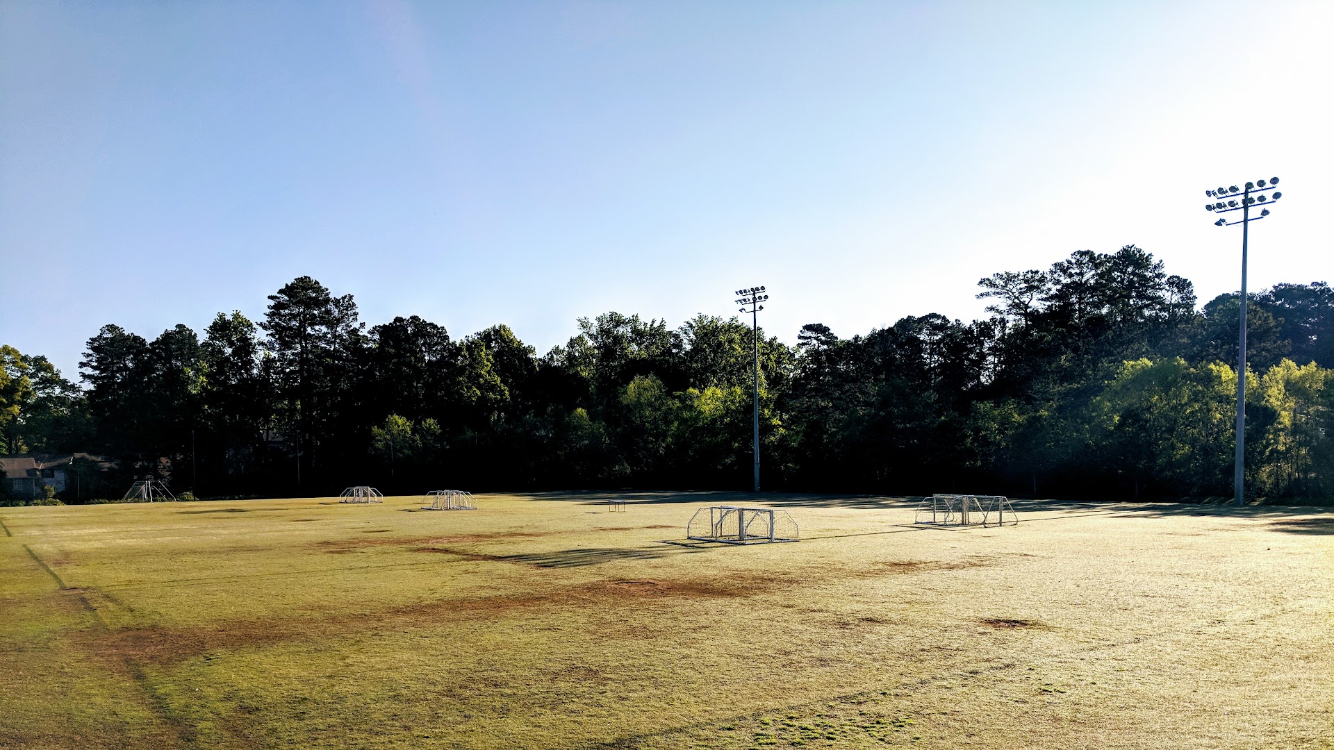 Park for soccer enthusiast. This park is great for practicing your soccer game. Many tiny league games are held here and the landscaping is always well kept. The park includes a small area playground for kids and a walking path that circles the park which is great for walking the dog or having that morning run. Lots of bio bag structures around the park and a doggie fountain for your pet. The park is also adjacent to Fire Station no# 3 and is across the street from a family Dollar convenience store. The park can become quit crowded during the kids soccer games but this park accomodates a huge parking lot with handicap parking and a restroom facility. There are benches around the park and a shaded sitting platform to keep you shaded from the Georgian extreme...