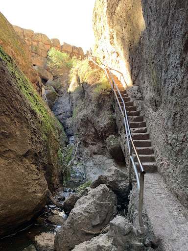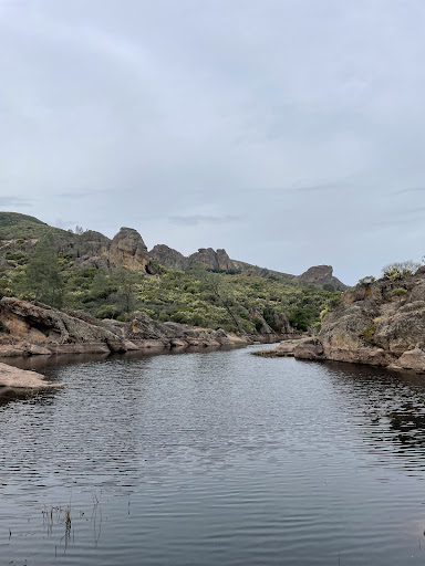 This is one of the best spot of Pinnacles NP. If you arrive the park early (before 10AM), you can drive to the Bear Gulch Day Use parking lot directly and park there. If you come later, there is a shuttle from Visitor Center to the Bear Gulch Day Use park. There are two ways to reach the reservoir. One is Moose Trail, the other one is through the Bear Gulch Cave. Personally I prefer the Bear Gulch Cave trail, which requires you to carry a flash light, because some part of the cave is really dark. But I saw people just used their smart phone's flash, looks fine. There is a steep, narrow stair steps to reach the base of reservoir. Once you reach there, it is a really scenic view. Around the lake, there are several other trails you can hike. You will also see the people hang on the middle of the rocks, yes, lots of rock climbers in the park The round trip is just a little short of 2.0 miles, it took about 1 hour and half. During the winter time, the temperature is about 60 degree. In the summer, it is easily over 90. So be sure to bring a...