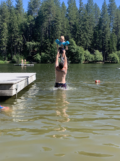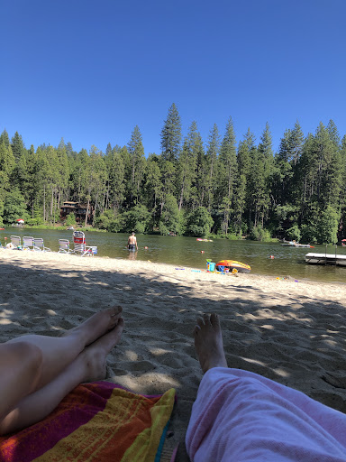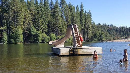 This is a wonderful hidden gem, perfect for a summer get-a-way. The lake is private so you must rent a cabin with "lake privileges". It's especially great for families with young children. It has a long sandy beach perfect for making sand castles. There are shallow roped off areas for wading plus 2 slides a bit further out dropping off directly into the lake. Teens enjoy crossing the dam walkway to the Rock where they can sunbathe or make use off the two diving boards. There is also a snack shack with basic lunch items and swirl ice cream and shaved ice....