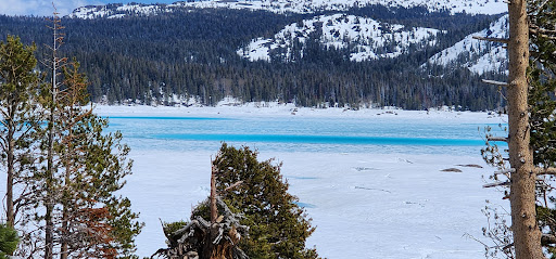 Whether blinding white, covered in ice during winter, or deep blue in summer, at 7,800' altitude, this alpine lake, with its forest-lined shores, is picture-puzzle perfect. Whether it's snowing, or the waves are lapping against the shores, it's quiet and peaceful. One tributary (Woods Creek), on the east side of the lake, is accessible via a seldom-used trail (Woods Creek Trailhead), just off the road, to the right, at the east end of the lake. There is a well-shaded parking area with a single vault toilet. The trail begins next to the toilet. Due to lack of use and maintenance, it quickly becomes obscured and is not always obvious. If you get lost, simply remember that following the shore of the lake will eventually bring you back to the main road. The second tributary (Emigrant Creek), is located on the southeast side of the lake. It is accessible via the Emigrant Lake Trail. The rock formations across the road, on the north shore of the lake, are easy to climb and offer a view from a couple hundred feet above the lake, as well as a valley beyond, and a section of the Pacific Crest Trail to the northeast. There is a small campground as well as a place you can rent boats. If you're going here, do yourself the favor of leaving some time to enjoy it's serenity and features. You will be glad you did. It gets cool at night, even in summer, and cold in winter, so plan...