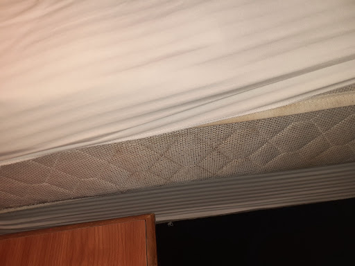 We knew ahead of time, thanks to reviews, that the hotel is quite dated. That itself is totally understandable and not an issue on its own. The issue, I think, comes from a combination of extreme cost cutting and a general apathy of the staff. The cabinetry and bathroom door have several holes and cracks which have been painted over with wood filler and left at that. There is black mold forming on the ceiling and door inside the bathroom, probably because the exhaust fan does not work. The toilet seat is peeling and looks disgusting, the toilet fill valve causes terrible water hammering so that each time you flush the toilet, it sounds like a helicopter is just outside the window. Then there are small things like the lack of a coffee maker, alarm clock, the fact that the TV channels are all overlaid with static like the old analog antenna days, the mattress in the pull out sofa has compressed to maybe 2 inches thick and the cover has ripped about 12 inches on either side of the corner. The shower curtain has skits all along the bottom that allow water out onto the floor or towel, the toilet paper holder was missing, the bathroom sink stopper was broken, the toilet tank float had been bent in order to cut the water flow when it was half full, which would use less water but also prevent proper flushing. One of the box springs is covered in stains that look very much like vomit, chunks and all. There were two dead American roaches in the lower cabinets, and then later that night there were 2 live roaches roaming the kitchenette and the area near the beds. The carpet has holes and has stretched over the years so that there are lumps and waves in it, and I stepped on a nice spot of chewing gum between the beds. The public restroom and the hallway leading to it reeked of pee like a seedy gas station bathroom. The light bulbs all over the room are mixed colors so that when you turn on the room lights certain areas are nice and warm colored while the opposite side of the room is harsh cold white like a...