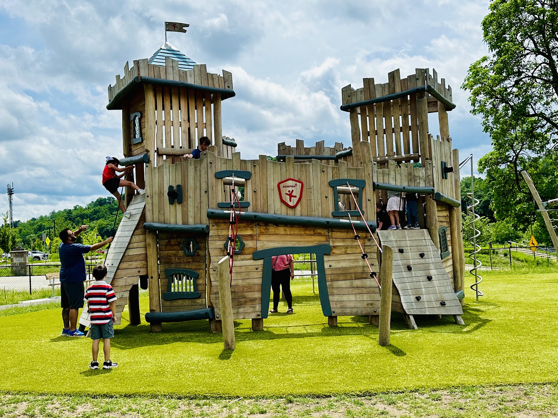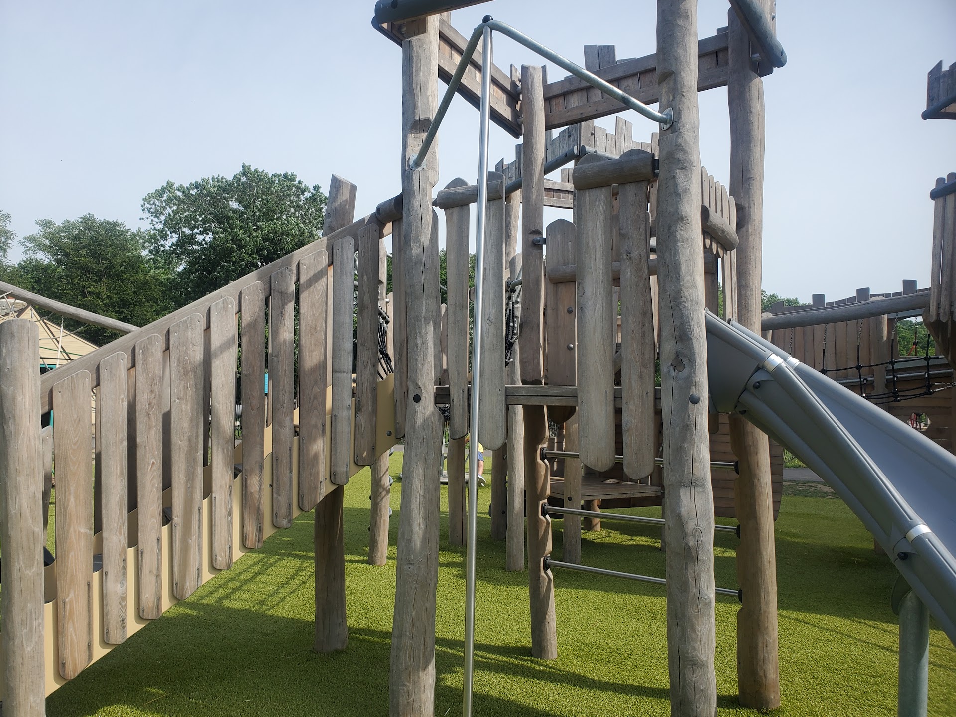 A great worsen structure with some different things to do beyond the slides. Lots of area a to crawl under and climb on. The big thing was a rope climb that my teenager even gave a try. A spider web of ropes nearby can hold a large amount of kids. A few slides and a rope bridge. A large amount of kids play here.