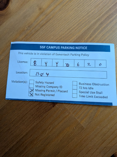 Today, 07/06/2025 I parked on public shore parking lot (address: 1 DNA WAY #24, SOUTH SAN FRANCISCO) and got ticket from Genentech Security. My violations were: missing permit and not registered vehicle. I called the security and asked what is the reason for the ticket. The answer was: now you know there is Genentech`s property. I know that on The City meeting board (06/30/2025) was decided to sell portions public roads (DNA Way and Point San Bruno Blvd) to Genentech. My question is will public get an access to park in the area...