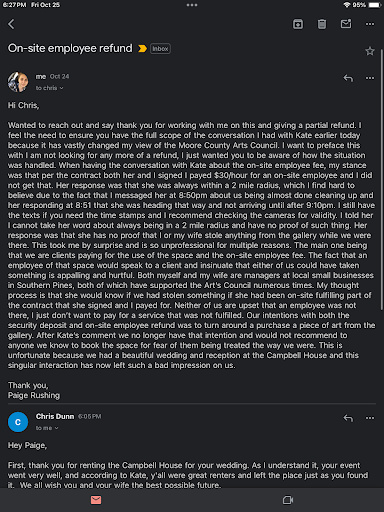 I want to give a shout out to the Arts Council of Moore County, it is definitely a gem to our community. Their regular gallery exhibits at Campbell House are always spectacular. The staff is super nice and always willing to help. Throughout the year they offer a creative variety of arts events and performances.