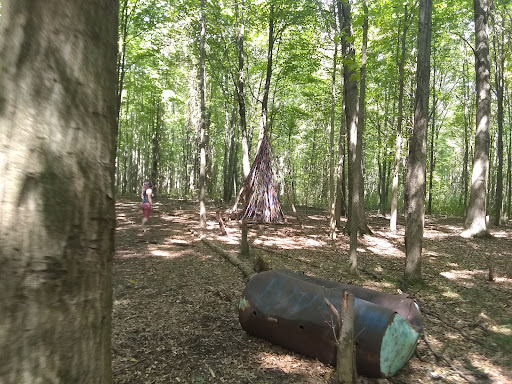 This park is surrounded by trees, which is nice and there appear to be trails which we did not venture off to. There are plenty of picnic tables and trash receptacles, as well as a porta potty on-site. There are also benches facing the playground surrounding the park. The parking lot is gravel and there aren't too many parking spaces.