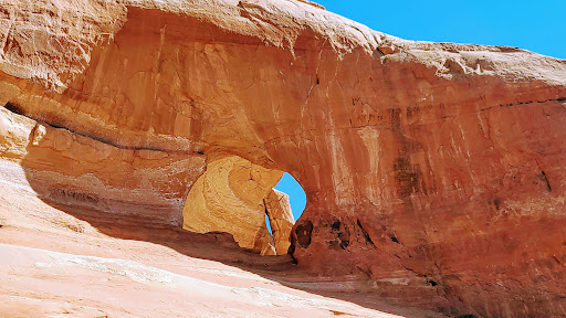 We love this arch. It’s a beautiful place to simply hike around if nothing else. If you are into mountaineering, it’s a fun climb up the east side. You can repel down the large amphitheater face. And, if you know what you’re doing you can swing from the ledge too. Driving instructions: just off US 191, take a dirt road for a few minutes. Follow the road to see the west side of the arch. To see the East side, take a left along the dirt road and follow until you see a bar wire fence. Head west along the fence until you arrive at a big rock. Hike around the rock southward to see the arch. This parking area is where you can begin climbing. 4x4 or AWD is...