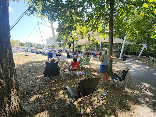 An awesome outdoor venue for summer festivals and live entertainment. Pretty much everywhere is a good spot to catch the entertainment. The chairs you bring, or blankets, or even just sitting on the grass itself... There's really not a bad "seat" in the house. The stage sits back, nestled in the woods. So it's tends to stay a bit cooler, and generally keeps the sun's rays at bay, at least...