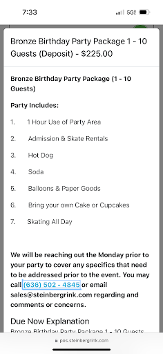 I would NOT recommend this Skating rink, under no means. If this was the last option for a birthday party I would rather cancel the party. The current management team is a pretty cool guy named Joe and a younger African American girl. Joe was very transparent and respectful. I refuse to say the same for the other manager and the owner. I reserved this hall for a 12year old birthday party in which we choose the Bronze birthday package. This birthday package comes with 10 wrist bands to make a person eligible to skate. This package also came with 2 boxes of pizza, that were terrible. The staff ended up sending our table 5 boxes of pizza and we informed management we would not pay for the additional 3 boxes of pizza, as our bronze package only came with 2 boxes of pizza. The younger female manager then proceeded to charger our card for a package that was double the amount of the bronze package. Upon learning this out the manager was very, rude, inconsiderate and unprofessional. She made verbal threats and was not transparent at all towards the situation. After the verbal threats were made the manager decided to call the park ranger, the police and then the owner. The owner was also very rude, he automatically came in and went to the defense of the female manager. He was not open to hear what happened and what the issue of wrong and right was. He kept telling us he didn’t care about us being double charged and we needed to leave the premise. The owner is very close minded and does not need to be in charge of a social gathering event hall where differences between employees and guest will happen. The owner didn’t even attempt to escalate or ask our side of the story. On top of the bathrooms being very dirty and out of supplies. The pizza that was offered was terrible, it by no means should meet any standard for being served to humans. Some staff was very helpful and respectful towards guest, but how can a business run efficiently if the owner and manager can’t be transparent and open minded towards issues. If you choose to visit this establishment, hopefully you don’t encounter the rude, ignorant young African American female manager. Everybody has things they are dealing with in life, but your outside world shouldn’t impact your business/customer relations. The owner also refused to return the amount that was charged unauthorized even after 2 employees clearly told police officers they only gave us the 10wrist band bronze package. We also asked the owner to review the cameras. The cameras will clearly show less than 10people in our area with skates on. In stead of going back and forth we asked the owner to review the surveillance footage and he refused. On top of being charged for the service this place offered, we were threatened arrest if we didn’t leave. This was a very bad look for the business and very traumatizing for our kids. Please listen to a paying customer and don’t book parties here. I would recommend a more professionally ran place somewhere in St Charles or St Peter’s. Dealing with business establishments in St Louis City and St Louis County, you will run into ghetto, unprofessional, threatening...