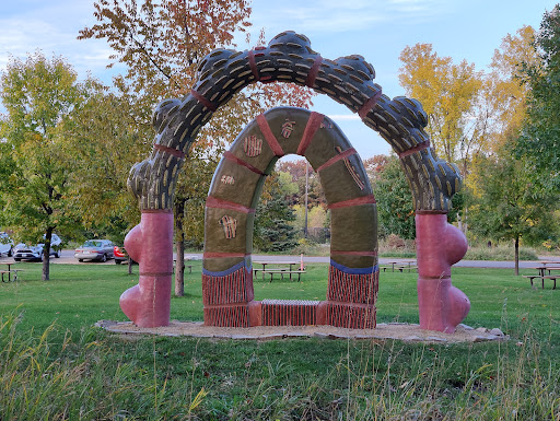 The modern art displays that have recently become more common in the park are strange and an eyesore. There are a few pictured in this review, and unfortunately many others that are often made of materials that stand in stark contrast to the natural beauty (a recently installed one is a concrete cask with a mowed field of artificial metal or plastic flowers around it, and others are structures made of rusty metal - the rusty "5", concrete, plastic, artificial colors, etc). A few years ago there was even a DVD player set up on a tree stump inside the nature center that looped a video of teenage girls silently throwing cheese puffs at one another in various nature scenes (I'm not joking). The empty container of cheese puffs was displayed next to the stump. These modern art displays have taken over a very nice space inside the nature center, where there was a comfy couch in front of a lovely fireplace. The couch has been removed to make room to display these modern art pieces and the fireplace is never turned on anymore. It's unfortunate - we really miss the ability to cozy up in front of that fireplace. But the park is otherwise very lovely, and we'll be coming back for...