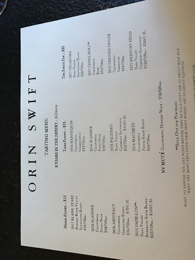 Read moreWe had a remarkable “Paper Tasting” at Orin Swift Wines, especially thanks to Ian Seletsky and the Paper tasting. Ian's attention to detail, incredible storytelling, and genuine kindness made our day incredibly special. He went above and beyond to ensure we had an unforgettable time, even surprising us with chocolates to make our anniversary even “sweeter.” Additionally, he worked to tailor our experience to wines that matched our personal preferences and that we were most interested in trying. Of the many wineries we visited in Napa, this was undoubtedly the best experience.