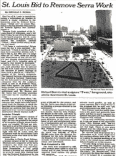 Read moreThe Serra sculpture, known as Twain, has created controversy from the beginning and was proposed by the St Louis Board of Alderman to have it removed. What is art? There have been many critics of this sculpture, mainly because of the stark nature of the shape and material. It was also considered a waste of precious downtown real estate, although being in the Gateway Mall, it was never zoned for a building. However that didn't stop the Peabody Plaza from being erected in the 1980's, much to the chagrin of the St Louis...