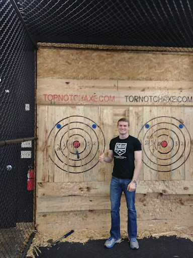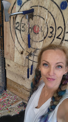 No one was in there at the time so Kenny let me choose what area to throw it & then he went over how it works , the precautions, forms, etc. He gave the perfect tips / tricks to adjust my throw and make me feel more confident/natural. He took the funniest (but actually good) pics of me with the axes at the end. I had a blast!