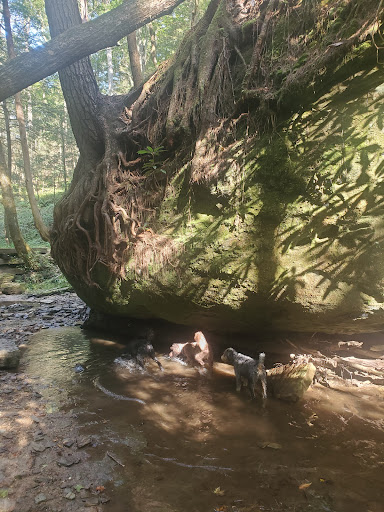 You have to park and walk through a campground to get to the trail. The trail was awesome. Didn't even go the whole trail. Since the creek by the bridge was optimal for our dogs. We also happened to go when little to no one was there.