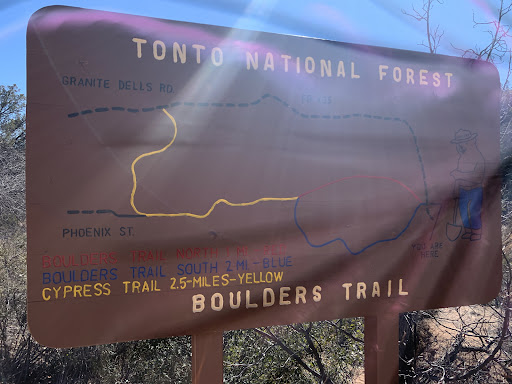 When you first arrive, go past the stupid gate, and sign that sez camera, 100-200 feet, and you will see a giant wash. There is a National forest sign there; you now are at the N. end of Boulder Loop. CROSS the wash directly West to the trail as it follows the wash west; and go south, and west, to start the S. end of Boulder Loop. The trail follows the washes, as trails will do; you are going West. Ignore the ranch and signs to the East; it's grandfathered land, surrounded by National Forest lands, from 150 years ago..