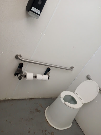 Clean, nice smelling pit toilet with hand sanitizer. Large parking lot.