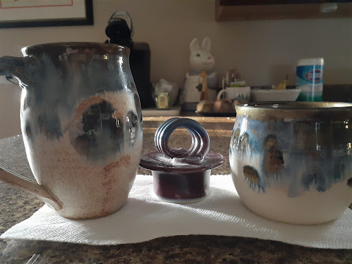 We went to visit Gauley river pottery 6/23/23, what a friendly, nice pottery store. After being held up at the door by the loud vicious guard dog, to find out he was just excited there was someone new to play with. Upon entering, we seen the workshop where the pottery is made and all the goods for sale. The gentleman owner, I don't believe we ever got his name, was friendly, extremely talkative and informative on many topics. While shopping "Loki" the playful guard dog brought us his toy and wanted to play the entire time. Well, we did did,as we shopped. He is so darn cute! We ended up buying a few items of quality pottery that is made there, and we definitely made a friend with the owner,and a playmate with Loki. Please stop by and say hi, make some new friends and the quality pottery is beautifully made! Oh, and by the way, Loki is a tiny ankle high dog that will win...