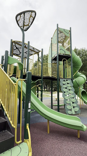 The splashpad is great but the park is almost unusable, especially in the summer. The large slide is basically not functional; the angles in the design are so sharp that its painful to actually use as anything other than a climbing tube, how can one slide at a right angle? The turf is a rubber composite and gets so hot in the sun that it burns kids feet. They also recently added a chain to the pictured swing that makes it impossible to get your kid in and out without the latch hitting you or them in the head. The rest of the small slides, swings, and gym get so hot because the turf is radiating heat that it burns to use those as well. The whole thing is just so much hotter than the outside actually is, it's uncomfortable to be in. It's the first time EVER that my son got heat sick and we were there for an hour. I just cant emphasize enough how uncomfortably hot the turf makes this park. It's a busy park because kids will play with anything but it really needs to be fixed...