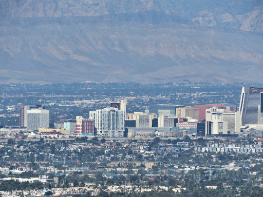 This spot allows a view of the strip skyline. Its just at the edge of eastern LV, before heading to Lake Mead National Recreation Area. It was a quiet Sunday morning, and we stopped before heading to LMNRA. The pullout was littered with broken glass and bottle caps, bad for tires. The view was nice, but the garbage strewn desert here is very sad. From where this photo was taken, just after Hwy. 147 leaves the city, it is 14-miles to the Strip. It's probably best viewed at night, but we were here in the morning. Not sure I'd wanted to be here after dark. that and the garbage there...