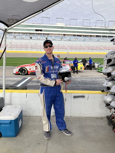 First, I'd say Vegas Speedway is thrilling. It's a mile and a half and really quick. The turns have super banks. The cars go around the track almost by themselves. It took a few laps to learn the track and know how to approach the turns.
