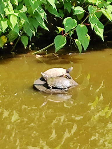 Pond has long angled wood bridge overlooking about 20 swimming water turtles, couple ducks and a few goldfish etc