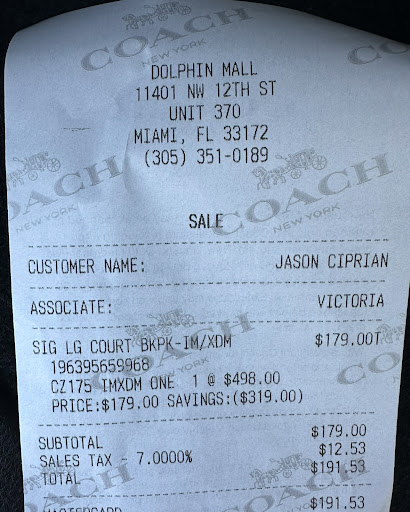 Read moreOn Saturday, I went to the Coach store at Dolphin Mall to get my purse fixed. When I entered the store, I approached a manager (short blondish hair) and explained that my purse was damaged, but I didnt have the reciept. She explained that the warranty only covered the hardware, that leather was not covered, without a receipt they couldnt help and they couldnt look up customers, because their system had changed. She walked away and left me standing with my daughter without further assistance. I proceeded to make the line and the cashier who lack the English language, stated the same. I attempted to look for the receipt online but I couldnt find it. I moved over and asked the cashier for the Coach customer service number. I contacted the customer service line and within 5 minutes the receipt was sent to the store via email. I was so upset over this whole incident. I explained to another manager (long brownish hair) the ordeal and asked why didn't a manager assist me with the process. Where is the customer service and professionalism? I regularly shop at Coach and I explained to them that I rather spend the gas to travel to Florida City Coach, then coming to this store again. I then asked for the store manager ( Cindy Carleo), but she couldn't speak with me because busy on the phone. I was brought a business card to call her later. When I asked for the District Manager name, I was advised she was out of the country and the store manager couldnt advise the name. I then proceeded to call customer service number again, where I was provided wirh the name of the District Manager. A little assistance goes a long way. I will not be bringing my business...