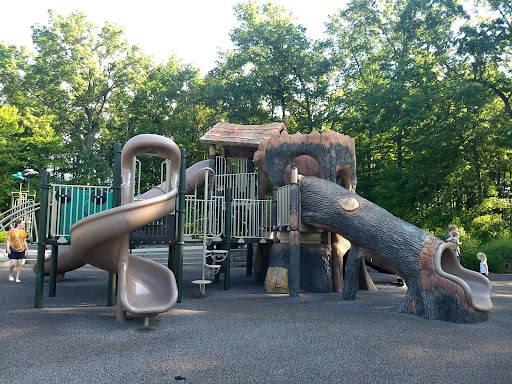 The playgrounds have a natural, earthy aesthetic, with "tree trunk" slides and plenty of climbing opportunities, making it a favorite for adventurous kids. The splash pad, open seasonally, adds to the appeal, especially during the warmer months. The park also provides ample seating, picnic areas, and nearby restrooms, making it convenient for longer visits.
