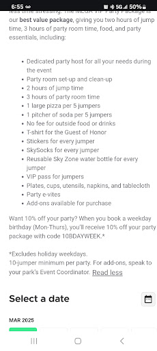 Read moreWe booked a party for my grandsonâs 8th birthday. We had been there before for my granddaughterâs birthday in May and it was a great experience. But apparently they have new ownership and new policies. We arrived 15 minutes early. At that point we were told that weâd have to stand in the lobby for the first hour and wouldnât get into a party room until the second half of the party. We suggested that they let people know of that when they book the party because in May that wasnât the policy. I went to the snack counter to order some food and was told they would have to ask if they could serve food at that time. I said,âYou mean you donât always serve food?â And the associate nearby said in a very rude tone, âNot when weâre making party pizza we donât.â This confused me because I was told they were booked all weekend and I canât imagine that they would stop serving food to the rest of the guests. I was told to come back in 15 minutes for my corn dog order. When I came back there was no one at the counter. I waited 5 full minutes and finally had to ask at the front desk for help. I was told to wait for 24 seconds and my order would be ready. A few minutes later I was told it would be out in a minute. When I finally got my food it was burnt in places but I was hungry and ate it anyway, standing in the lobby waiting for our room. We were escorted to a party room an hour later and it was a disaster. A mess from the last party. Liquid spilled all over the floor and tables and benches. Cake also all over the floor. All the decorations were still up from the previous party. Trash everywhere. Garbage can was full. We had 15 minutes until our own guests arrived so we helped clean the room and get our own decorations up. I used the bathroom which was as much of a disaster as our party room. Water everywhere, toilets unflushed. Paper towels and toilet paper littered the floor. I was told the menâs bathroom was as bad. When I returned to the room our âparty hostâ had disappeared and didnât come back until we were almost done with our hour. I guess I was just so annoyed with everything because the whole thing cost over 400.00 and my expectations were high after a good experience 5 months ago. When I complained at the time of payment I was offered a quick apology but no offer for a conversation with the manager and no offer for a discount or any other compensation. We left feeling that we would never go back. If you are considering a party at SkyZone understand that this could happen again. Bring your cleaning supplies, and expect a lot of terrible service. I canât believe that I paid so much for so...