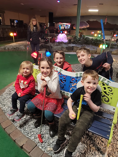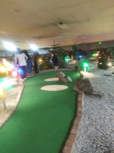 The mini golf gets crowded on the weekend starting around 2pm. A line starts to develop and you have to adjust to playing in between two other groups, bit it's still fun. By 4pm or 5pm you'll probably have to wait for 3-6 parties to go infront of you, standing in the Line to begin. They have a variety of size putters including child size and toddler clubs. The holes, themselves,, are challenging enough with some variety and have a range of skill shots vs luck. There are little drink tables at each hole where you can fill out your score card and place your drink.. as you are apparently permitted to bring drinks through the course. The 18th hole is deceptively the first hole you encounter when stepping into the minigolf section, so don't play this hole first because you'll have to go get another ball.