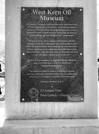 Historical plaque inscription: The Jameson # 17 oil derrick, which was drilled in 1917 and produced until the 1980’s, was scheduled to be torn down. In 1974 the local American Association of University Women and several dedicated people convinced Jameson Oil Company to donate the wooden derrick along with three acres of land to give the West Kern Oil Museum, Inc. a promising start.
