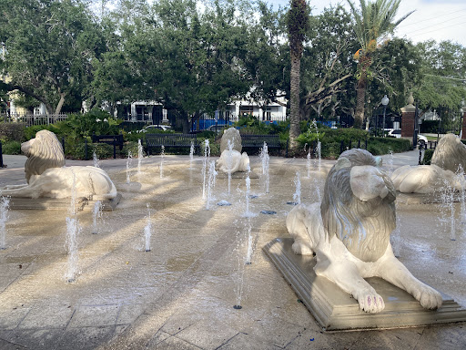 Fountain and splash pad closes at 7 PM, but the rest of the park is open until sunset. Splash area is small and sweet with four statues of lions pointing north south east and west and fountain spread between them.