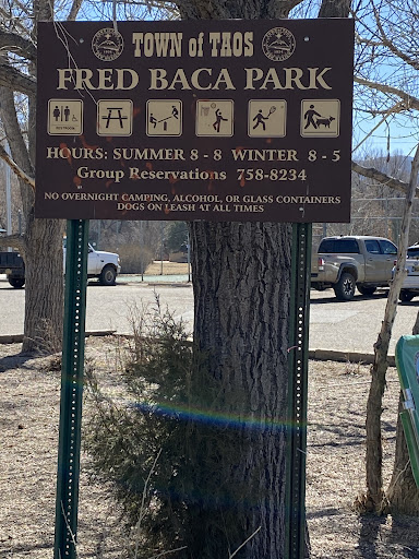 When road tripping through the Taos area we needed a place to late the pooch stretch her legs. After Googling around we came across this park and after stopping by, it was a great decision in the end. Even on a Saturday evening there were not a ton of folks around and there was plenty of space to throw the ball for the dog. The vaulted toilets could use a little help as all the windows were busted out and covered in plywood on the mens side, making it difficult to make a pit stop, but other than this, I would come back for sure. There is also access to a great boardwalk walking area that goes around some wet lands that are right next to the green space. If your in the area and need some connection with some green space, swing by here for sure! Next time i'm in the area i'll stop here...