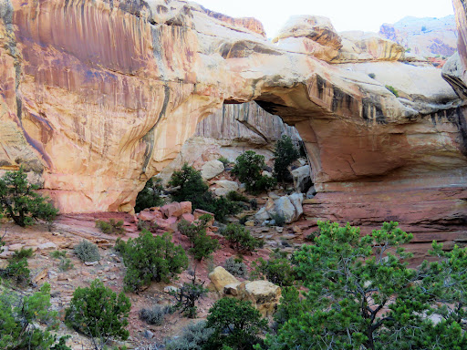 This is 2-mile RT trail back to see Hickman Natural Bridge. It gains 400 feet over the mile back in and is rated moderate. We picked up the trail guide marking the 17 viewpoints and set forth with water. It was well into the afternoon by now, and pretty warm. The beginning of the trail climbs some set sandstone steps up and along the Fremont River. The contrast of red rocks, green growing things, and blue water was lovely. Hickman Bridge is named after Joseph Hickman, who was elected to the Utah State Legislature in 1924. We hiked in a river bottom for awhile, and may possibly have lost rack of the trail, which was not well marked. Viewpoint 14 is the first view of the Bridge. If you aren’t looking for it, it will be missed, as the background behind the opening blends with what is in front. Viewpoint 15 is of Hickman Bridge. It is 133 feet long and 125 feet high. Viewpoint 16 discusses how the bridge was formed and passes under the bridge itself. At Viewpoint 17, turn around and look in the direction of the valley behind and to the side. It's a few more steps up and away from the bridge, but it is lovely. It's a view of the upthrust as the earth buckled and then folded over on itself. The Fremont River sparkles down there. There are no restrooms, either at the parking area or along the trail, and no drinkable water anywhere. Bring your own, wear decent hiking shoes with ankle support due to the slickrock all over, and plan ahead for...