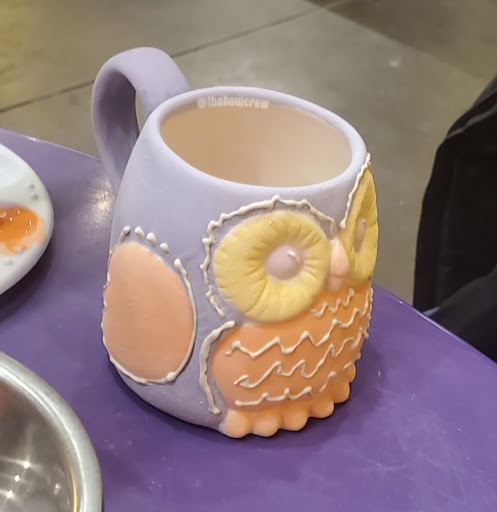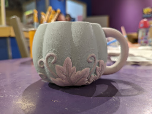 After you're done, they'll fire your piece to dry it, you pay, and come back another day to pick up. We we're part of a party so All the pieces were marked on the bottom and can be picked up together by the one who arranged the event. All the plates and cups are food safe. I chose to make a pumpkin mug to paint and paid for it separately to get my art fix. With the approximately $10 mug plus the approximately $15 "paint time", you're asked if you'd like to tip the employees who were constantly walking around, cleaning up messes, putting away paint, and in our case tending to our party needs. With all that, subtract the tip and $1 donation to Leukemia Research, my mug cost me a wonderful 1.5 hours and approximately $26. Picture attached of it painted as I have yet to see the finished product. Pictures of my girls painting their first pieces ever.
