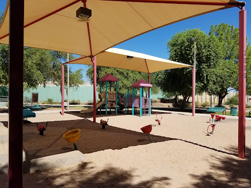 I came there and the first thing I see is that the middle of the park is flooded. I thought it was a lake at first.. While it did look scenic in a way, I found it odd that they would have picnic tables placed in the middle (which I learned from a previous reviewer, is an area that can get flooded from "irrigation schedule.") There is no sidewalk here, but rather a paved sandy path which can get muddy after it rains. The path makes a loop around the park. I saw a shaded play area and also a basketball court (unfortunately locked). I did like the colorful picnic tables along the path. They looked new and a nice shade...