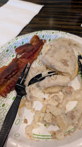 The breakfast was sub-par. They had biscuits and gravy, and the gravy had potential but fell completely flat. The plastic silverware is so cheap that a fork broke right in the middle of my meal.