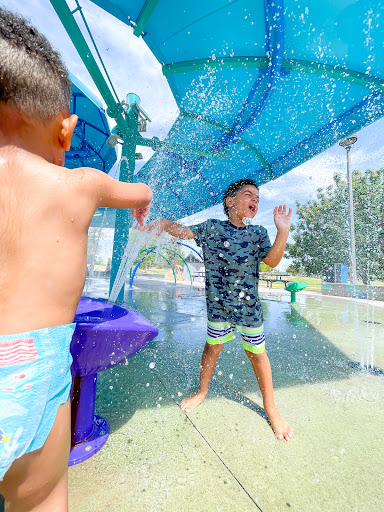 Pros- covered splash pad, small playground, 1 covered sitting area, sand pit, small slide, swings, larger grassy area, and bathrooms super close! I like this splash pad bc it’s not too big and allows the kids to do more than just be in the water.